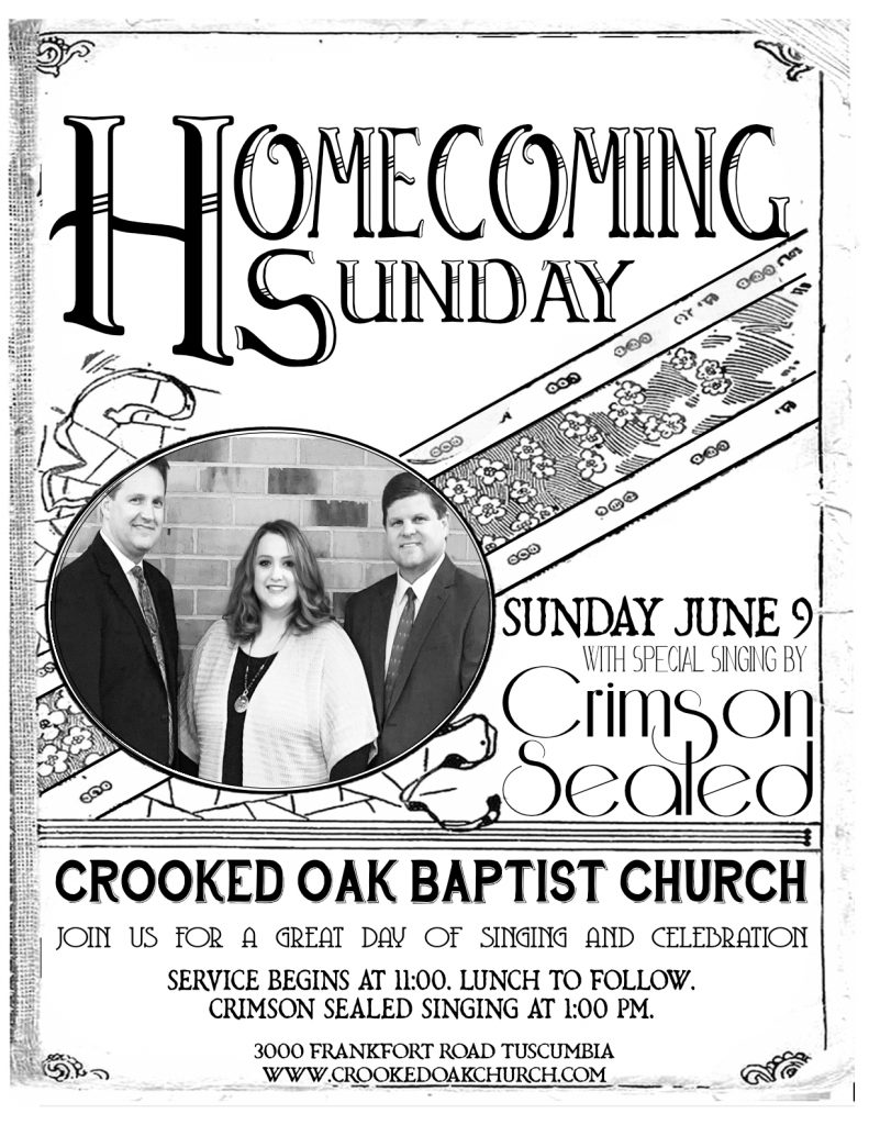 Home » Announcements » Homecoming Sunday Homecoming Sunday May 22, 2024 crookedoakchurch Join us the second Sunday in June for our annual Homecoming Sunday with special music by Crimson Sealed!